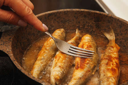 Fish pressed with a fork to fry on a frying pan, navaga, saffron cod.