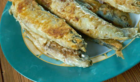 smelt fried in flour in a black pan close up view from above. seafood