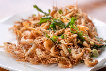 Salted fried crispy river shrimp prawn, Macrobrachium nipponense, in a white plate on wooden table, delicious Taiwanese street food, lifestyle.