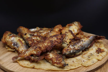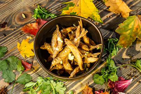 Appetizing fried capelin on a black plate stands on a wooden surface. Simple rustic food concept