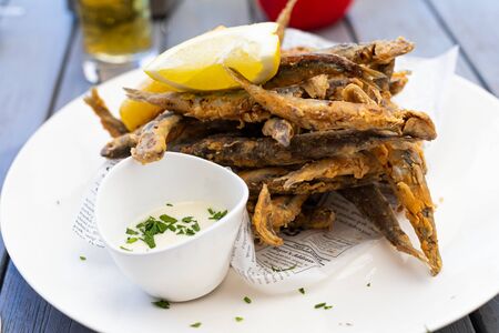 Crispy fried black sea anchovies (hamsi) with lemon and garlic sauce at the romanian seaside