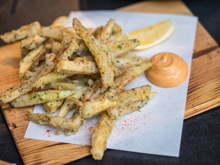 An appetizer in a restaurant, fried sprat on a wooden plate with lemon and cream sauce against a gray stone table