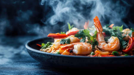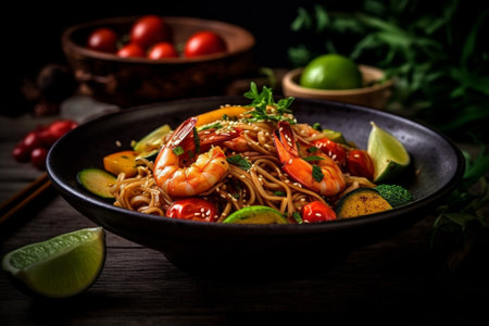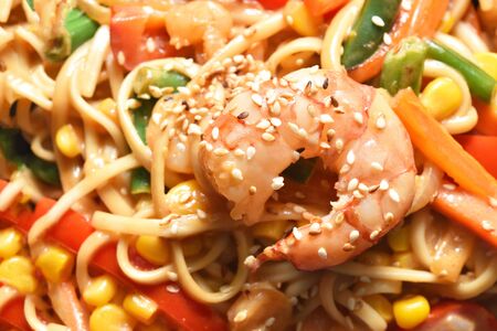 Appetizing wok noodles with shrimp closeup and vegetables.