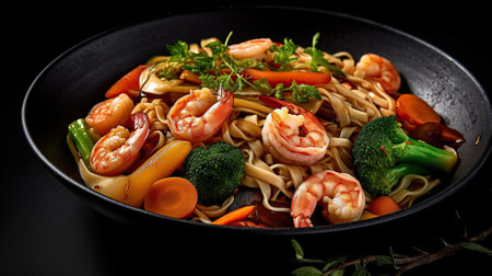Stir-fried spaghetti or stir-fry noodles with vegetables and shrimp in a black bowl. dark background, top view