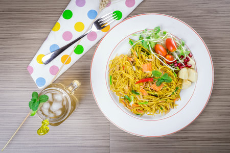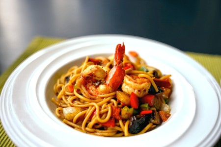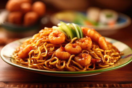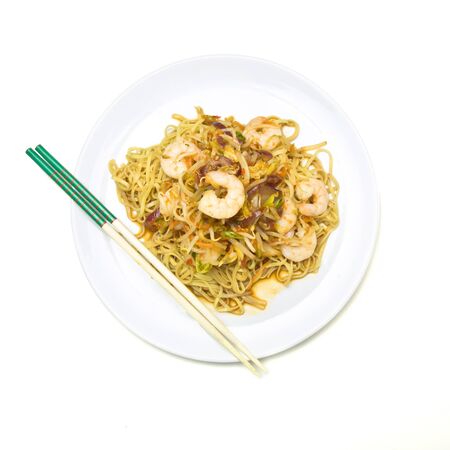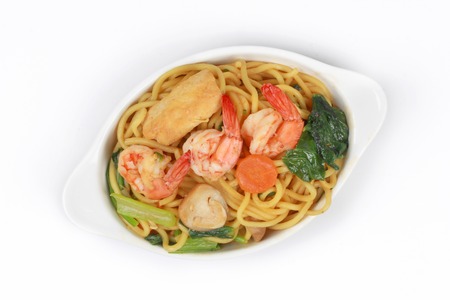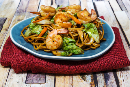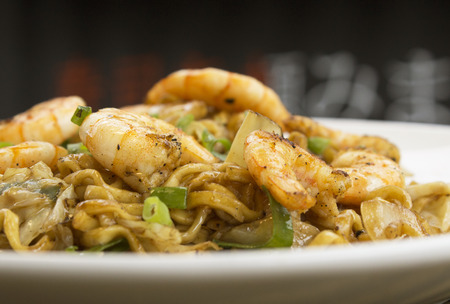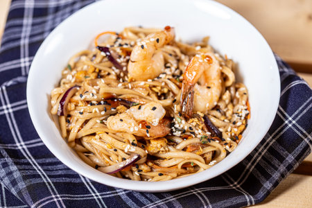 Traditional shrimp yakisoba. Japanese and Chinese Pasta