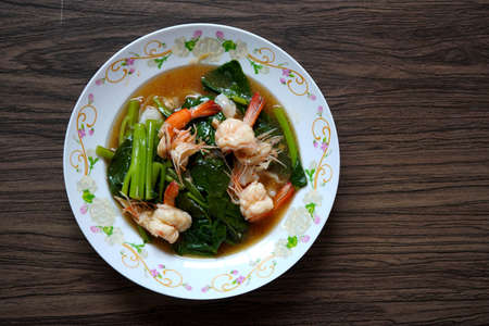 Fried noodle with shrimps and kale soaked in gravy on wooden table