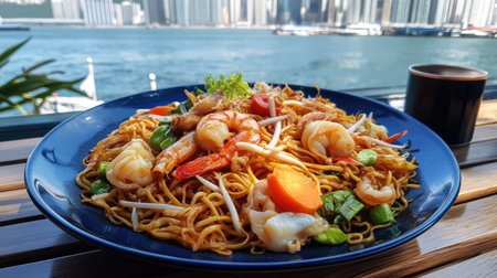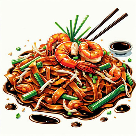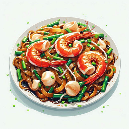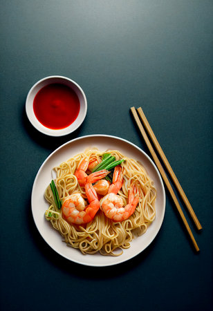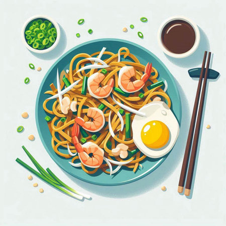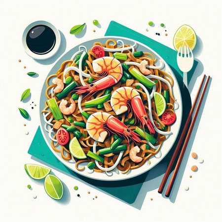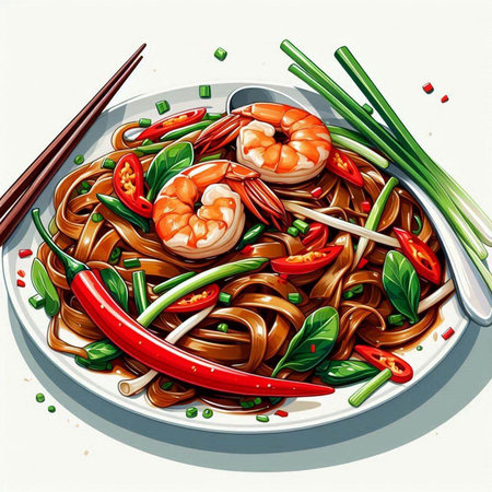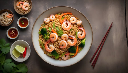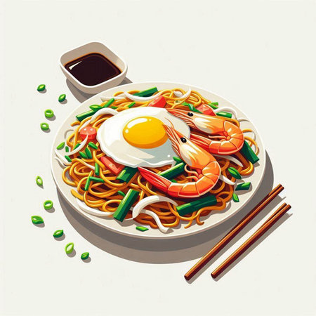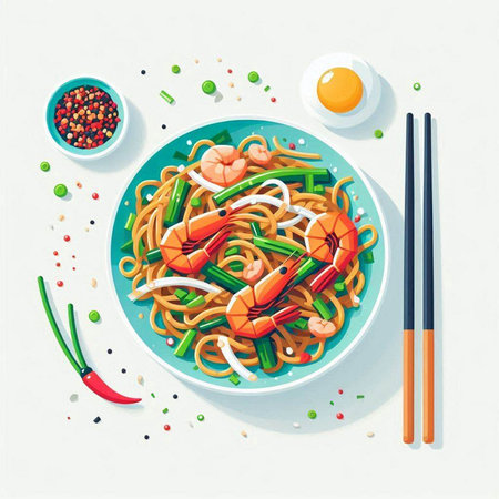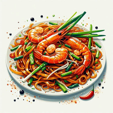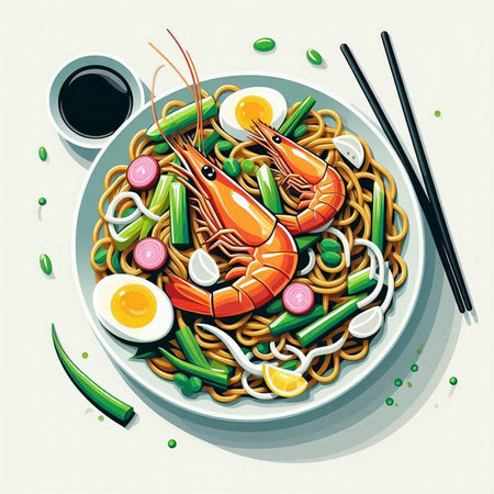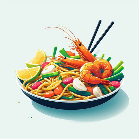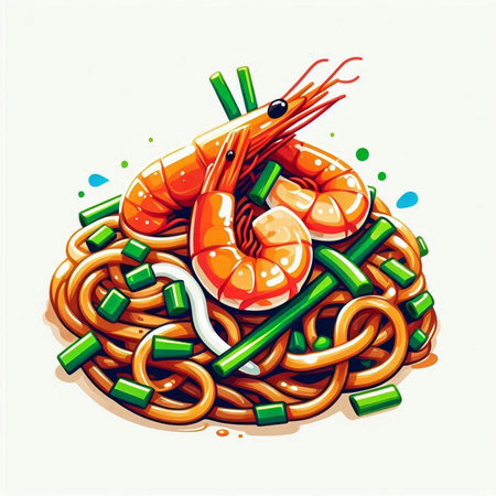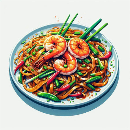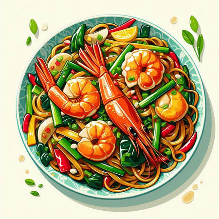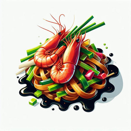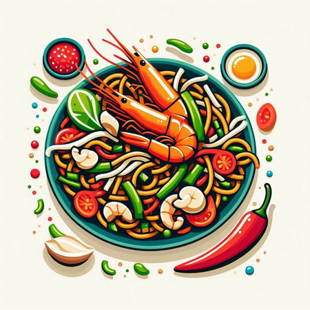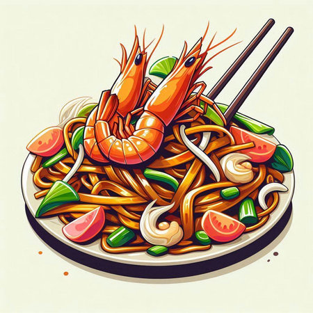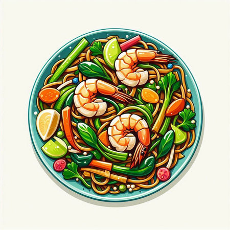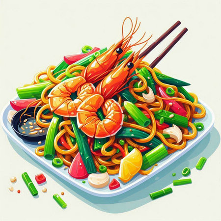 Illustration of a plate of chinese noodles with shrimp and vegetables