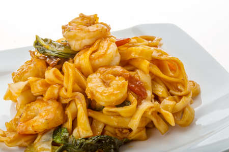 Delicious fresh pasta with tomatoes, shrimp and spices. Italian cuisine