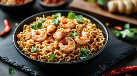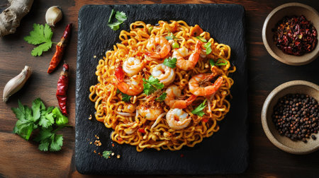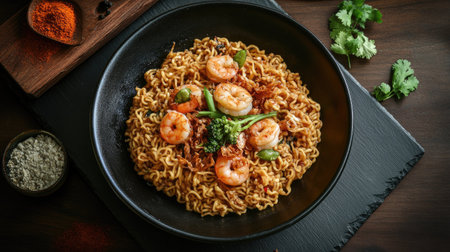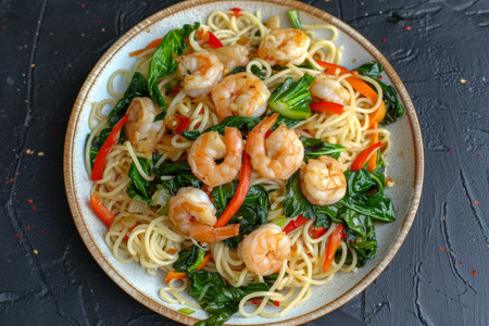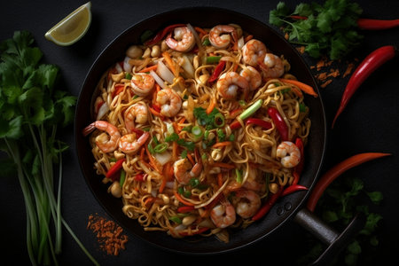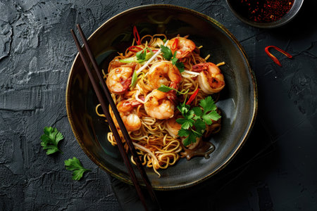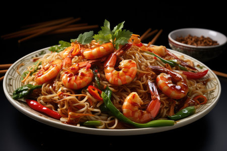Spicy fried Chinese noodle with shrimp on black. Top view.