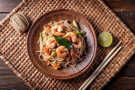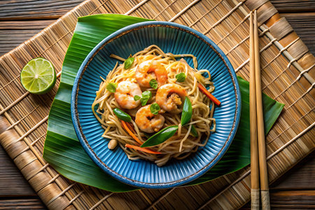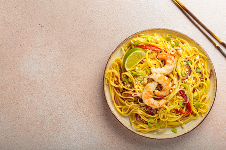 Pad thai noodles with shrimps, peanuts and lime on a plate, traditional dish of Thailand, space for text