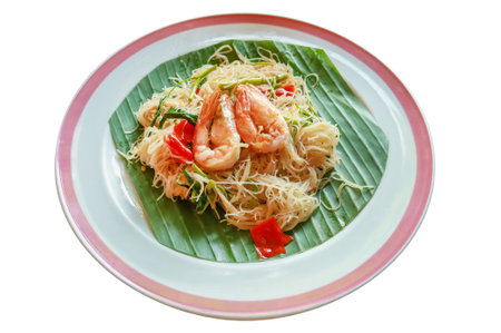 Die cut of Stir Fried Spicy Rice Vermicelli and Water Mimosa with Shrimps on white isolated.