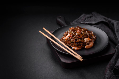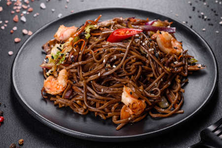 Delicious fresh buckwheat noodles with boiled tiger prawns, salt, spices and mushrooms on a dark concrete background