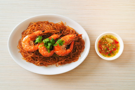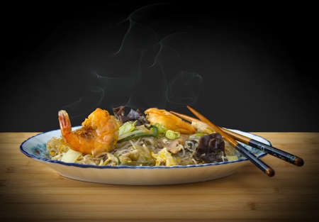 Smoke asia glass noodles prawn and vegetables on bamboo board