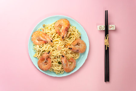 Fried Instant Noodles on a pink background with Shrimps Asian Thai food fusion style easy dish street food popular. top view bright pink background color.