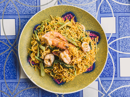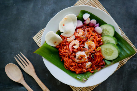 Mi Aceh, Mie Aceh or Acehnese noodles is a spicy dish typical of Aceh consisting of thick yellow noodles, slices of beef, mutton or shrimp, sliced ​​red onions, cucumbers with a savory and spicy curry sauce. on table