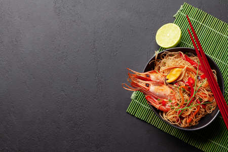 Wok with stir fried noodles, shrimps and vegetables on stone background. Top view flat lay with copy space