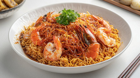 Crispy egg noodles with Prawn and Gravy Sauce served in local Thai dish.