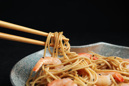 Tasty appetizing asian noodles with vegetables and shrimps on plate on dark background.