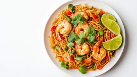 Pad Thai with shrimp and vegetables isolated on white background. traditional thai food