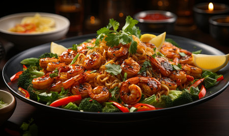 Chopsticks lifting colorful stir-fried noodles, culinary delight. generated by ai