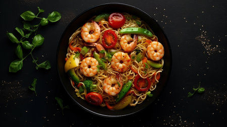 Stir fry noodles with shrimps and vegetables in a black bowl on a black wooden background, top view
