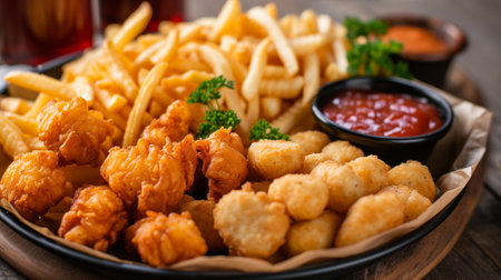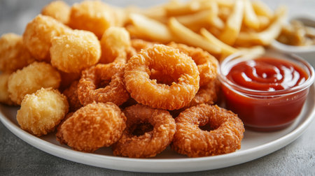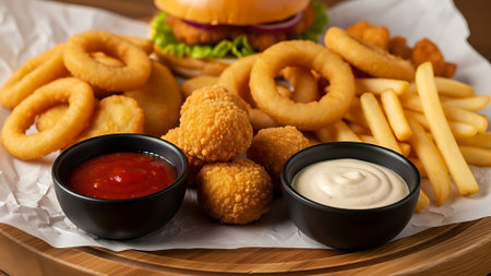 Top view of a tempting plate with onion rings, french fries, chicken nuggets, and fried chicken, ideal for fast food enthusiasts