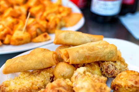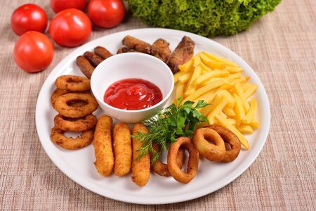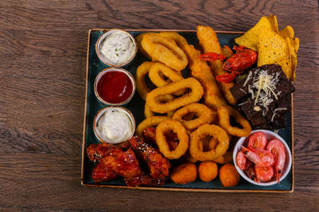 Delicious snack plate, french fries, onion rings, spring rolls or sausages on the table