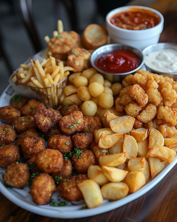 A tempting assortment of fried snacks served with various dipping sauces and crispy fries, perfect for sharing at gatherings or enjoying as a savory treat.