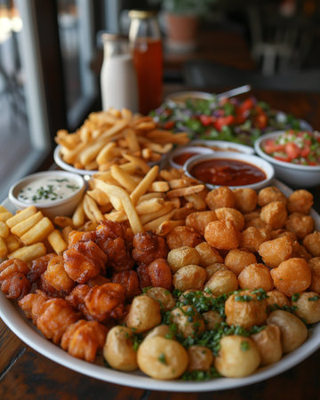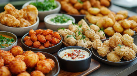 Delicious assortment of golden crispy appetizers for party buffet, garnished with herbs and served with sauces