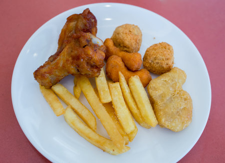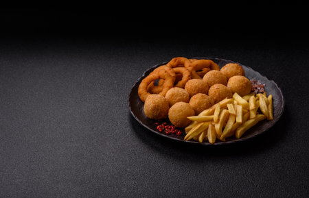 Onion rings, potato balls and fried chicken with fried potatoes and sauces