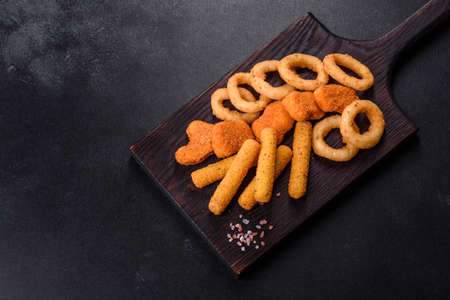 take away food mozzarella sticks, onion rings, french fries, chicken nuggets and sauce on a wooden board. banner, menu, recipe place for text.