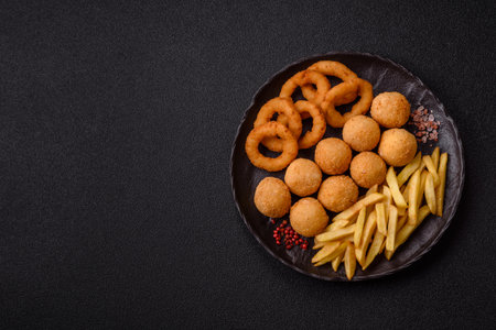 Fast food, cheese balls, onion or squid rings and French fries. Junk food as a background for your design