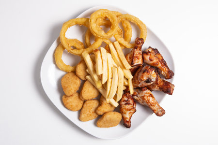 Top view of a tempting plate featuring onion rings, french fries, chicken nuggets, and fried chicken on a pristine white backdrop