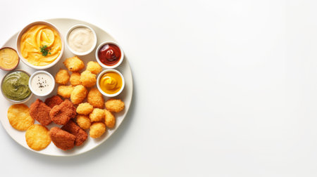 top view set of crispy golden fast food snacks with colorful dips on a white plate.isolated on white AI generated