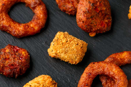 Variety of deep fried snacks on wooden background. Top view.