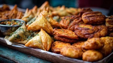 A visual feast of assorted fried snacks including samosas and pastries, beautifully arranged on a wooden platter. Ideal for food lovers and gatherings.