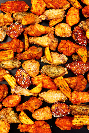 Deep fried Crispy chicken wings with different flavors and sauces on black background