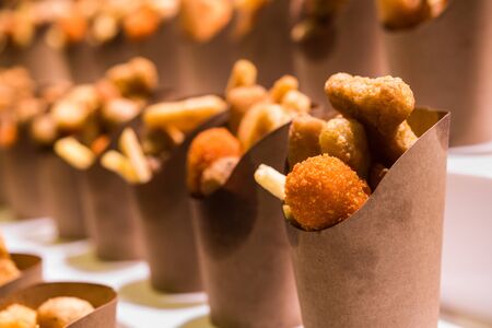 Fried snacks in paper cups on the city market, fast street food
