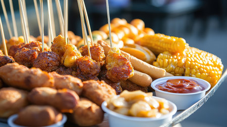 A vibrant outdoor platter featuring a variety of skewered snacks, fried treats, and fresh corn, perfect for summer gatherings and outdoor feasts.