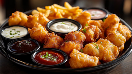 An enticing assortment of fried appetizers served on a decorative plate, accompanied by diverse dipping sauces ideal for gatherings and celebrations.