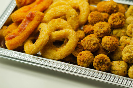 Southern fried and roast chicken bites, onion rings and mozzarella stick served on the silver tray, party bites