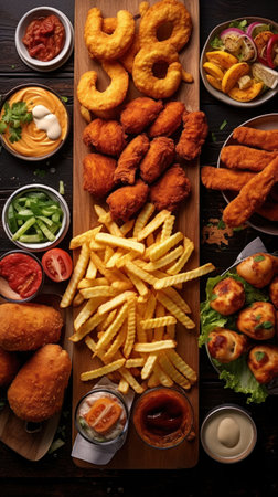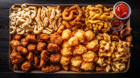 Top view of a mouthwatering assortment of onion rings, french fries, chicken nuggets, and fried chicken, arranged for visual appeal