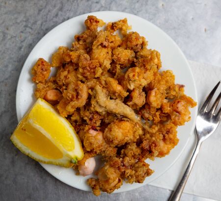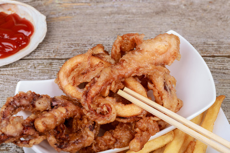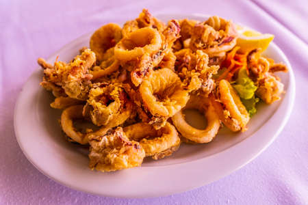 Ibiza, Spain - September 02, 2019 : Fried calamari