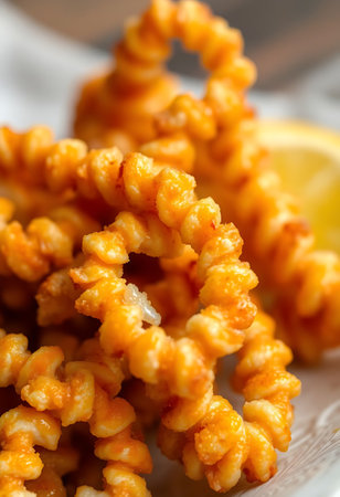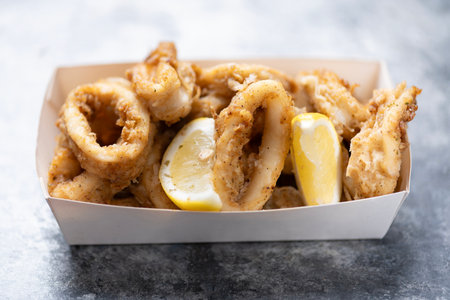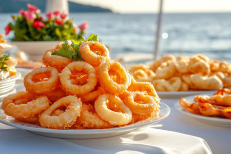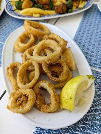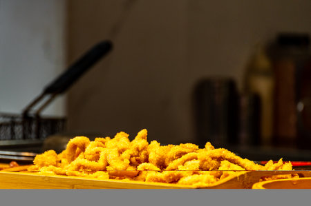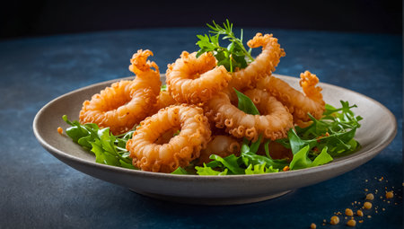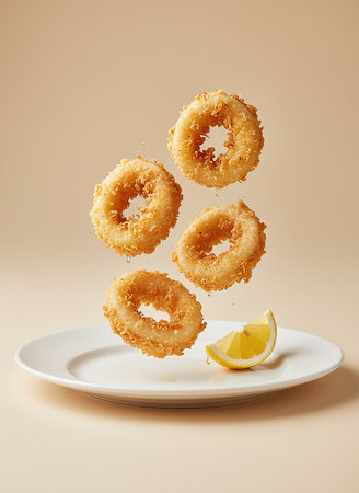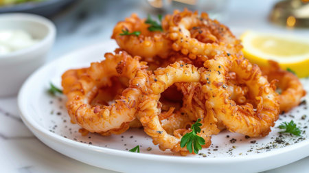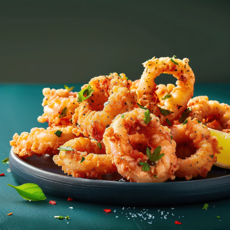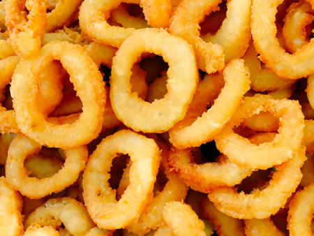 Delightful crispy calamari rings, perfectly golden and tender, expertly fried in oil