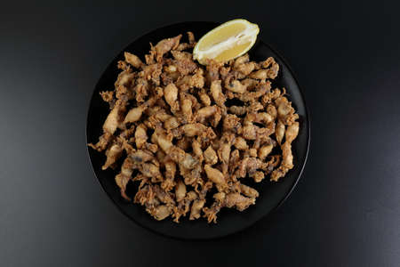 Ration of fried cuttlefish (squid tips) on black plate and black background