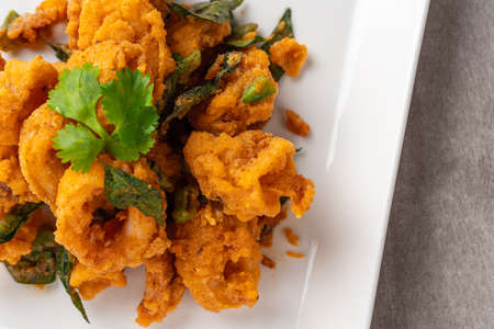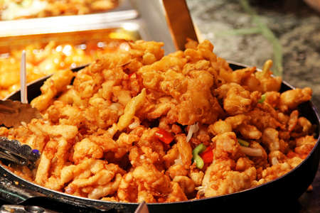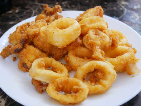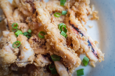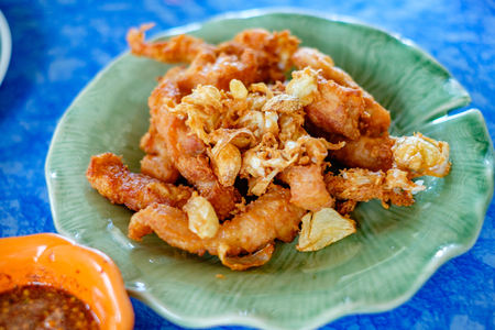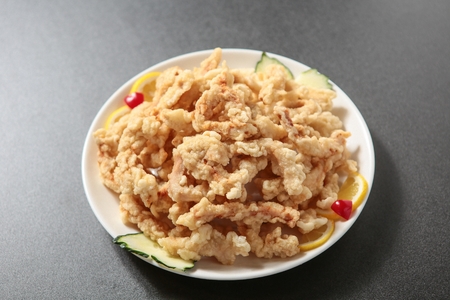 Squid cut into small pieces and fried with flour. The flour has been mixed with eggs to add flavour and to make it crisper.