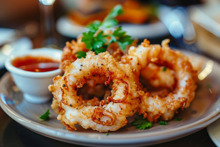 Fried squid ring in restaurant with sauce. Generative AI illustration