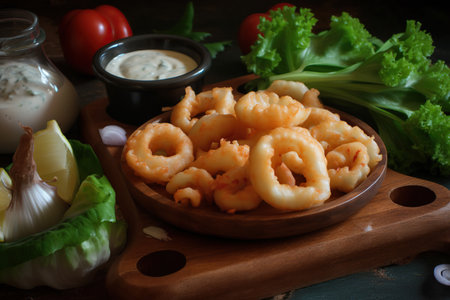 fried squid rings with mayonnaise sauce on wooden board and fresh vegetables, Generative AI