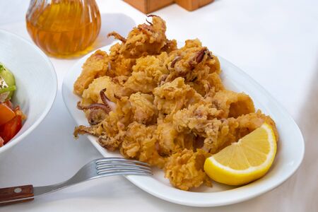 Mediterranean food in the restaurant. Deep-fried squid and fork on white tablecloth