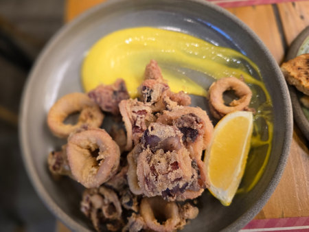 Delicious crispy calamari rings are presented on a plate, accompanied by a wedge of lemon and a bright yellow sauce. The setting is warm and inviting, perfect for enjoying seafood.